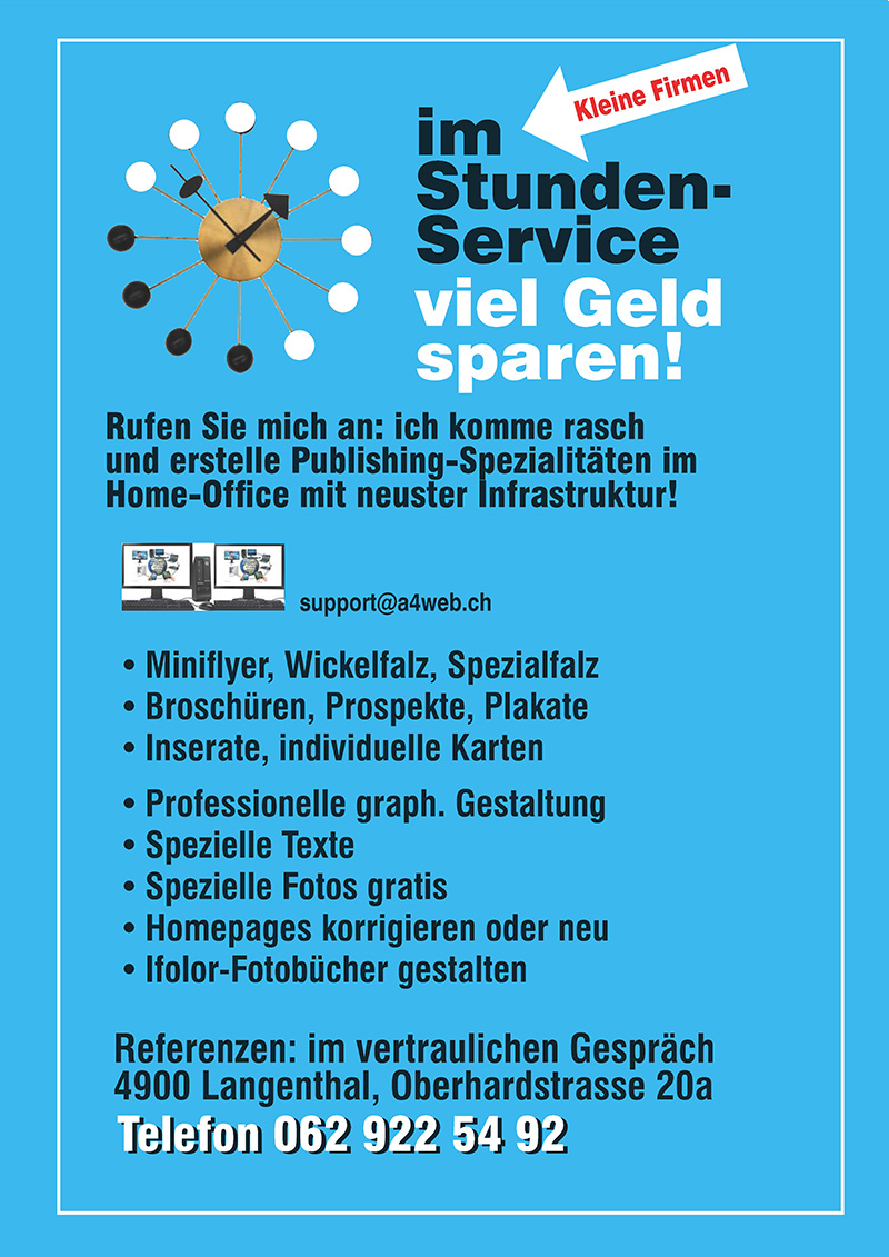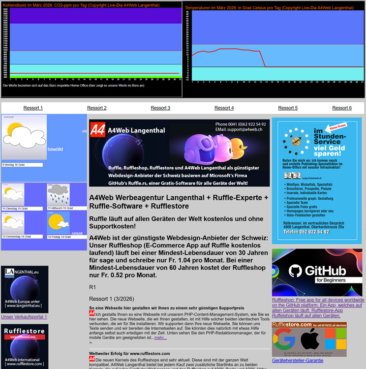 Kontakt: A4Web Werbeagentur Langenthal + Ruffle-Experte Ruffle läuft auf allen Geräten der Welt kostenlos und ohne Supportkosten! A4Web ist der günstigste Webdesign-Anbieter der Schweiz: Unser Ruffleshop (E-Commerce App auf Ruffle kostenlos laufend) läuft bei einer Mindest-Lebensdauer von 30 Jahren für sage und schreibe nur Euro/Fr. 1.04 pro Monat. Bei einer Mindest-Lebensdauer von 60 Jahren kostet der Ruffleshop nur Euro/Fr. 0.52 pro Monat. A4Web Advertising Agency Langenthal + Ruffle Expert Ruffle runs on all devices worldwide, free of charge and with no support fees! A4Web is the most affordable web design provider in Switzerland: Our Ruffleshop (an e-commerce app running on Ruffle, free of charge) runs for a minimum of 30 years for the incredibly low price of just Euro/US$ 1.04 per month. For a minimum of 60 years, the Ruffleshop costs only Euro/US$ 0.52 per month. A4Web Langenthal Andreas Lützenberger