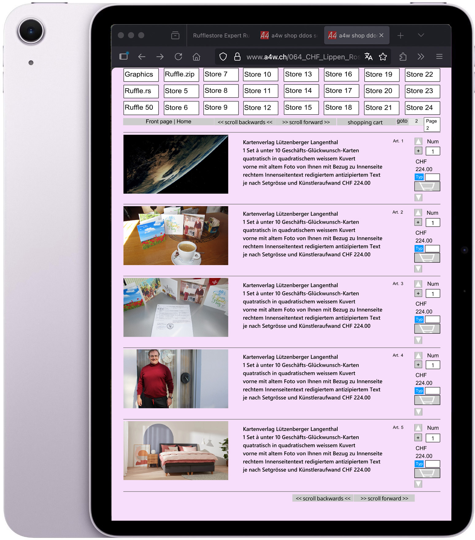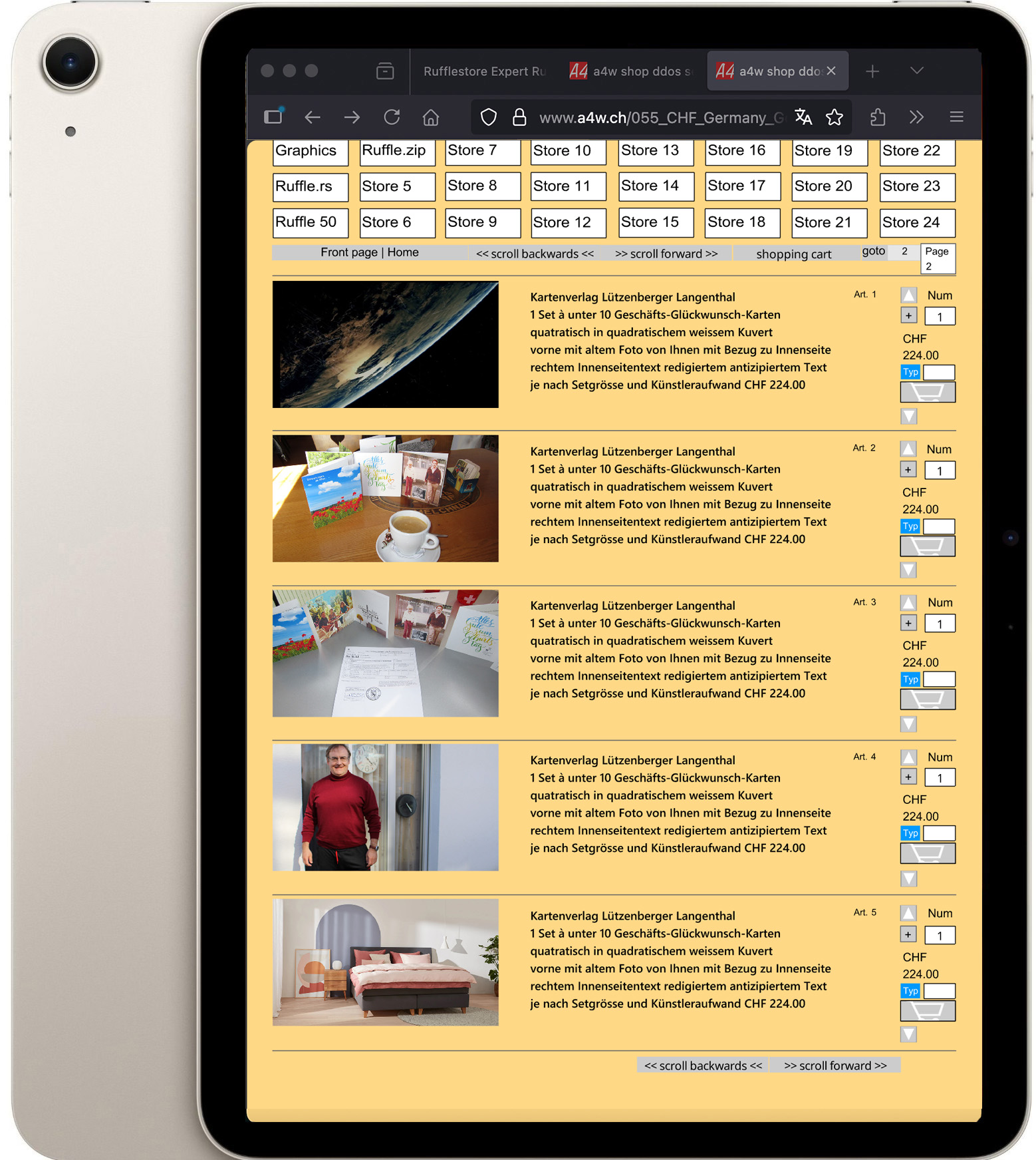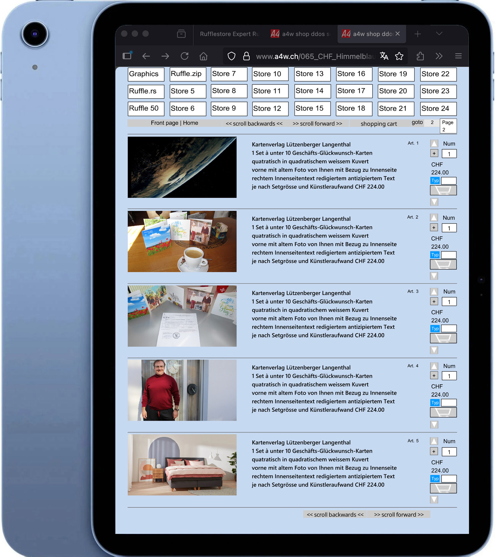 iPad 11 (2025) passt 1:1 auf den Ruffleshop. Auch das iPhone passt 1:1 auf den Ruffleshop. Dass der Ruffleshop immer passt, liegt an seiner exzellenten Container-Grösse vom 750 Pixel mal 1100 Pixel, welche mit skalierbarem Layout samt skalierbarer Beschriftung und skalierbaren Linien stets ein ausgezeichnetes scharfes Bild auf jedem Display resultiert. Links das Foto zeigt unser iPad 11 (2025) mit dem Firefox und Safari und unserem Intranetbutton (A4). Wenn man auf den Hauptbrowsern den Ruffleshop wählt, dann erscheinen überall genau die Displays 1:1 wie oben in den fünf Farben der Geräte und Ruffleshops (ebenfalls fünf Farben) abgebildet sind. Die iPhones und die iPads resultieren also ein sehr schnelles Handling mit der Ruffleshop-Software. Weiter unten (bitte nach unten scrollen) sind die Links zu den Ruffleshops in allen Farben als Muster abrufbar und Sie dürfen so einen Shop mit Warenkorbbestellung selbst testen weiter unten. Es löst keine Bestellung bei uns aus. Ruffleshop USD € CHF 375.- Ruffleshop Germany Gold and Starlight / Himmelblau and Blue / Rasengrün and Space Grey / Lippen Rosa and Purple / Grau and Silber Am Schluss soll es dann einfach schön aussehen. Ein Ruffleshop ist hochauflösend immer scharf und sieht stets gut aus. Besonders auf den neuen iPad-Serien von Apple passt diese Shopsoftware wie massgeschneidert auf das Display. Kaufen Sie so ein iPad wie oben abgebildet und bei uns einen Ruffleshop für nur Fr. 375.- (dann keine Kosten mehr 30 Jahre lang, also ohne Betriebskosten minus Fr. 10800.- |