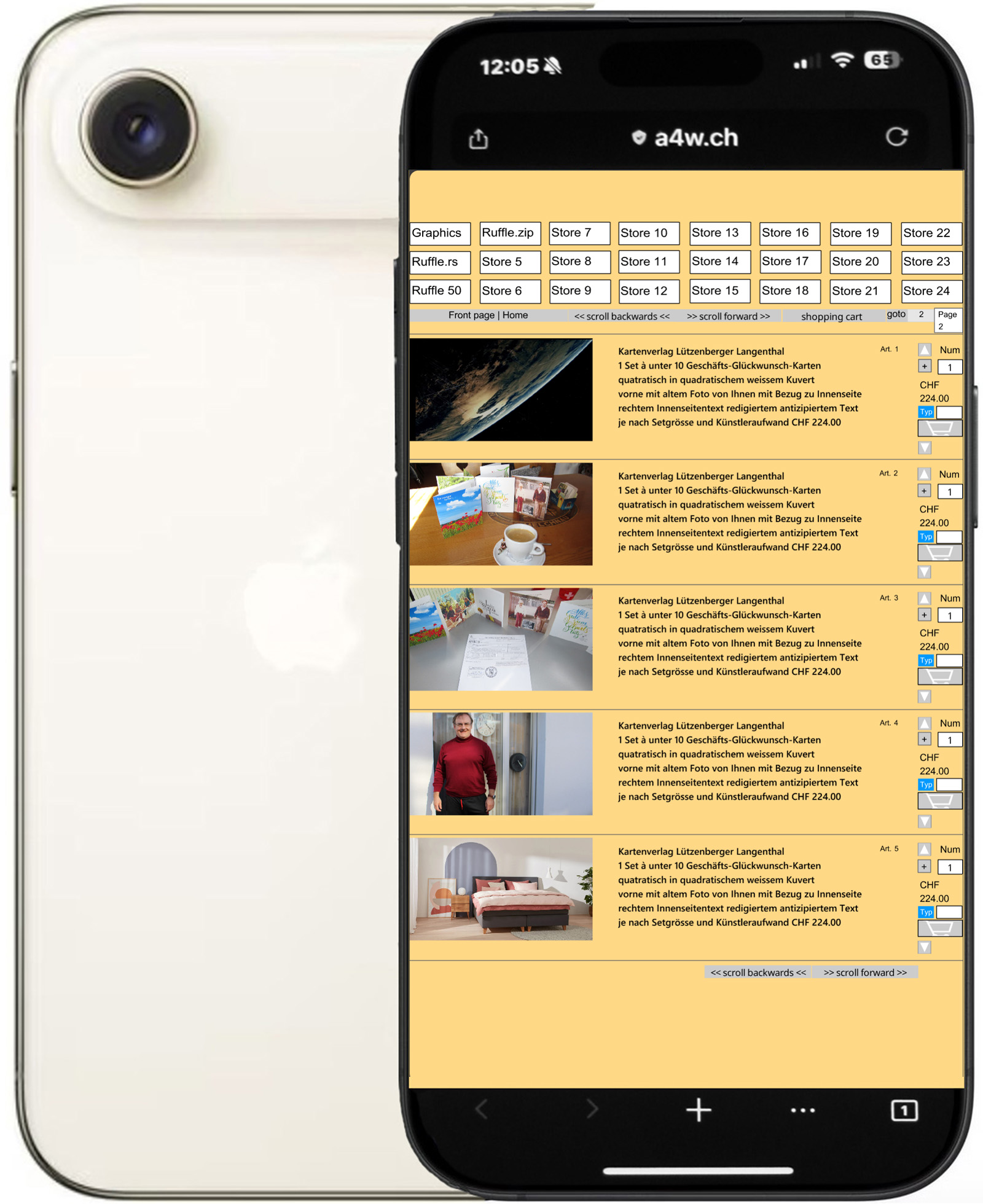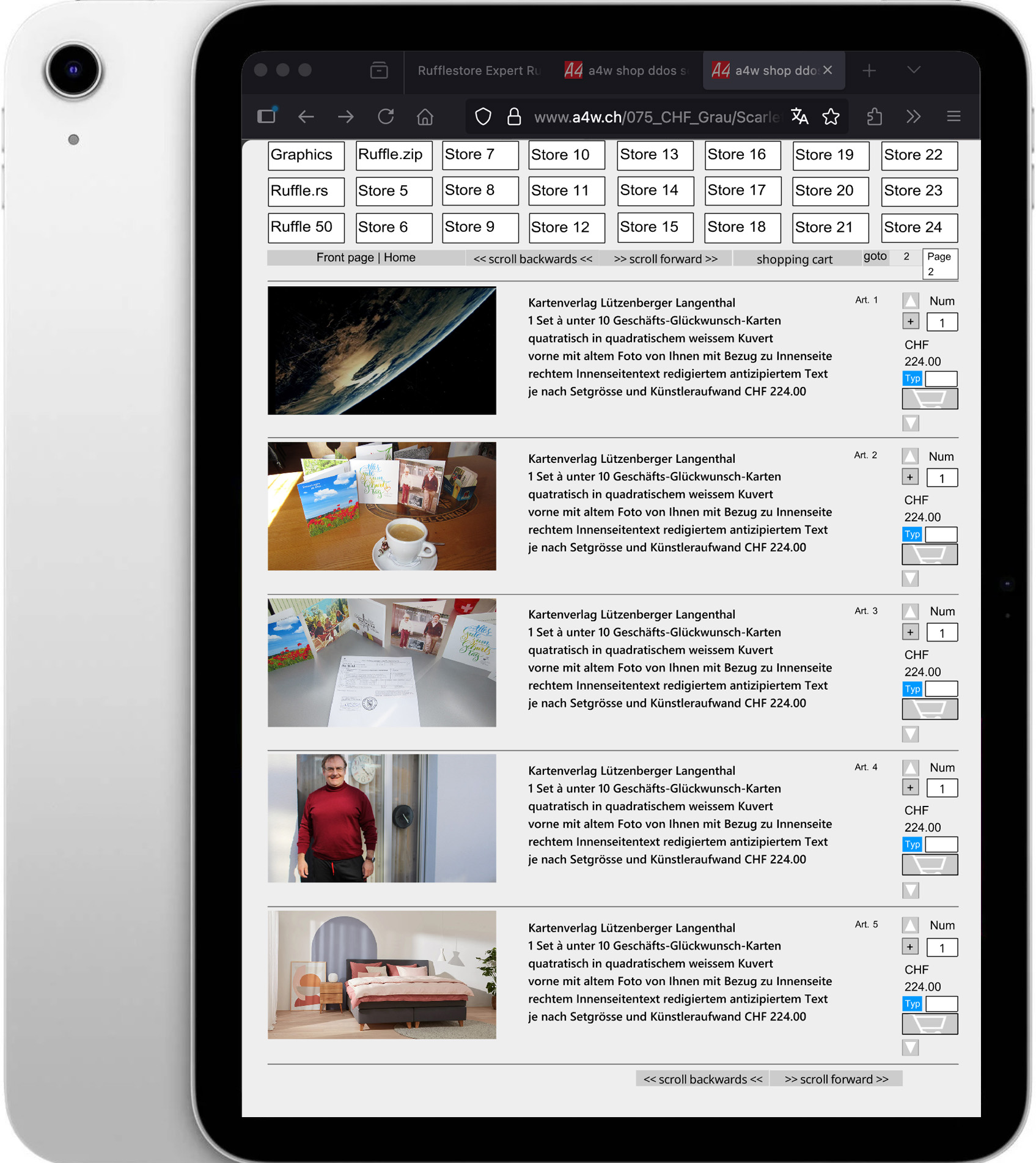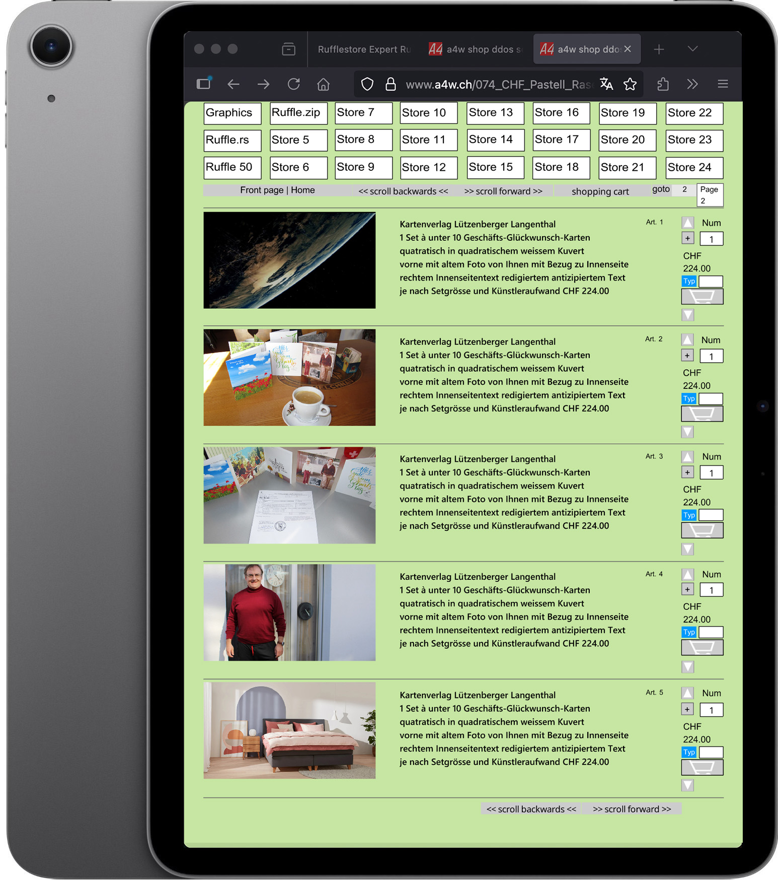iPad 11 (2025) passt 1:1 auf den Ruffleshop. Auch das iPhone passt 1:1 auf den Ruffleshop. Dass der Ruffleshop immer passt, liegt an seiner exzellenten Container-Grösse vom 750 Pixel mal 1100 Pixel, welche mit skalierbarem Layout samt skalierbarer Beschriftung und skalierbaren Linien stets ein ausgezeichnetes scharfes Bild auf jedem Display resultiert. Links das Foto zeigt unser iPad 11 (2025) mit dem Firefox und Safari und unserem Intranetbutton (A4). Wenn man auf den Hauptbrowsern den Ruffleshop wählt, dann erscheinen überall genau die Displays 1:1 wie oben in den fünf Farben der Geräte und Ruffleshops (ebenfalls fünf Farben) abgebildet sind. Die iPhones und die iPads resultieren also ein sehr schnelles Handling mit der Ruffleshop-Software. Weiter unten (bitte nach unten scrollen) sind die Links zu den Ruffleshops in allen Farben als Muster abrufbar und Sie dürfen so einen Shop mit Warenkorbbestellung selbst testen weiter unten. Es löst keine Bestellung bei uns aus. Ruffleshop USD € CHF 375.- Ruffleshop Germany Gold and Starlight / Himmelblau and Blue / Rasengrün and Space Grey / Lippen Rosa and Purple / Grau and Silber Am Schluss soll es dann einfach schön aussehen. Ein Ruffleshop ist hochauflösend immer scharf und sieht stets gut aus. Besonders auf den neuen iPad-Serien von Apple passt diese Shopsoftware wie massgeschneidert auf das Display. Kaufen Sie so ein iPad wie oben abgebildet und bei uns einen Ruffleshop für nur Fr. 375.- (dann keine Kosten mehr 30 Jahre lang, also ohne Betriebskosten minus Fr. 10800.- |