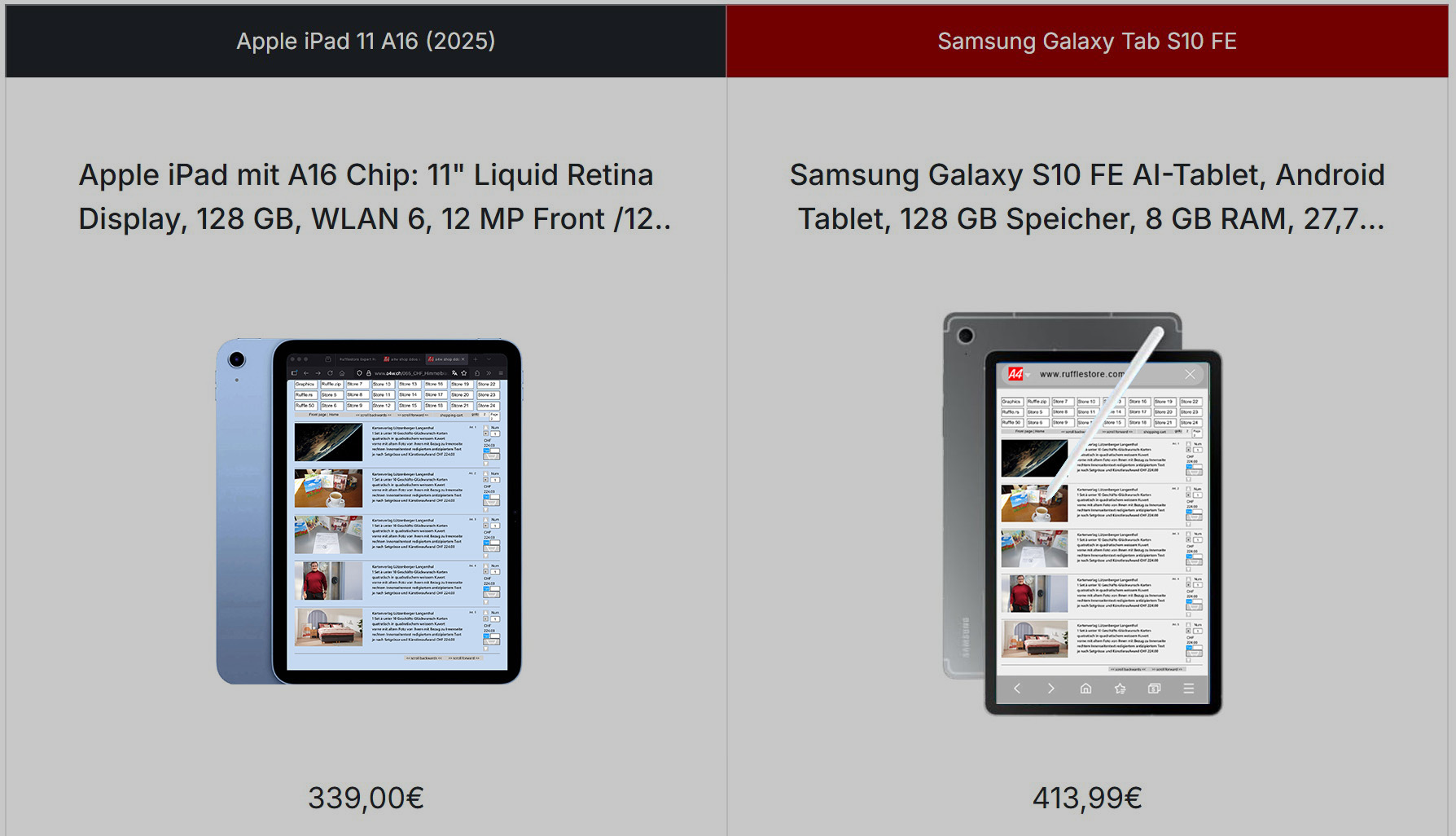 Anyone interested in an Apple or Samsung tablet in 2025 will quickly come across the iPad 11 with the A16 chip and the Samsung Galaxy Tab S10 FE. We tested both devices extensively in everyday use and were positively surprised by the high-quality build of both models. The iPad impressed with its razor-sharp display, ideal proportions, and seamless integration into the Apple ecosystem, which, when used in conjunction with an iPhone or MacBook, offers real added value. The Galaxy Tab S10 FE also left a very solid and premium impression. It offers a larger display, the flexibility of Android, and the option to expand the storage, which definitely has advantages in everyday use. Whether an Apple or Samsung tablet is more suitable ultimately depends heavily on your preferred operating system and individual needs. |