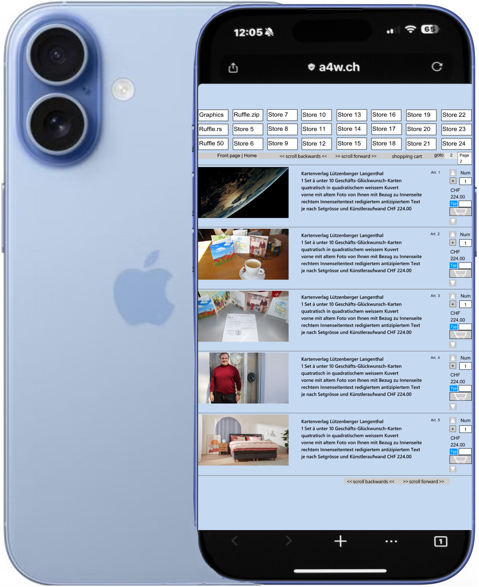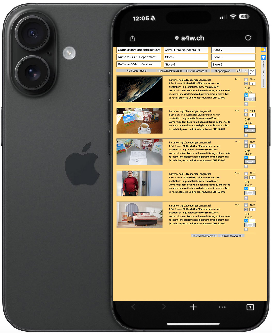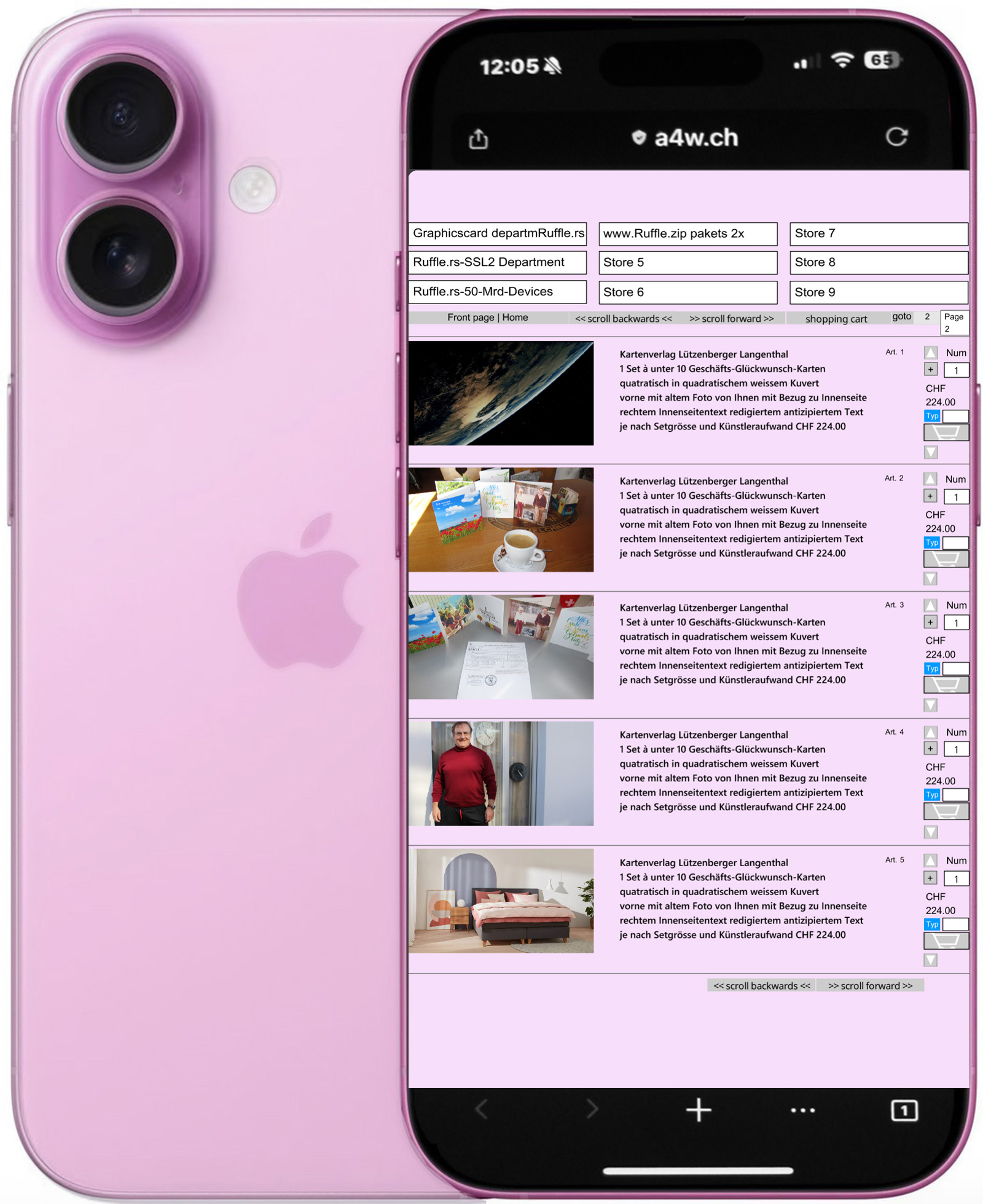 The iPad 11 (2025) fits 1:1 on the Ruffleshop. The iPhone also fits 1:1 on the Ruffleshop. The fact that the Ruffleshop always fits is due to its excellent container size of 750 pixels by 1100 pixels, which, with its scalable layout including scalable labels and scalable lines, always results in an excellent, sharp image on any display. The photo on the left shows our iPad 11 (2025) with Firefox and Safari and our intranet button (A4). If you select the Ruffleshop on the main browsers, the exact displays appear 1:1 everywhere, as shown above in the five colors of the devices and Ruffleshops (also five colors). The iPhones and iPads therefore result in very fast handling with the Ruffleshop software. Further down (please scroll down) you'll find links to the ruffle shops in all colors as samples, and you can test one of these shops yourself by placing an order in your shopping cart. This does not place an order with us. |